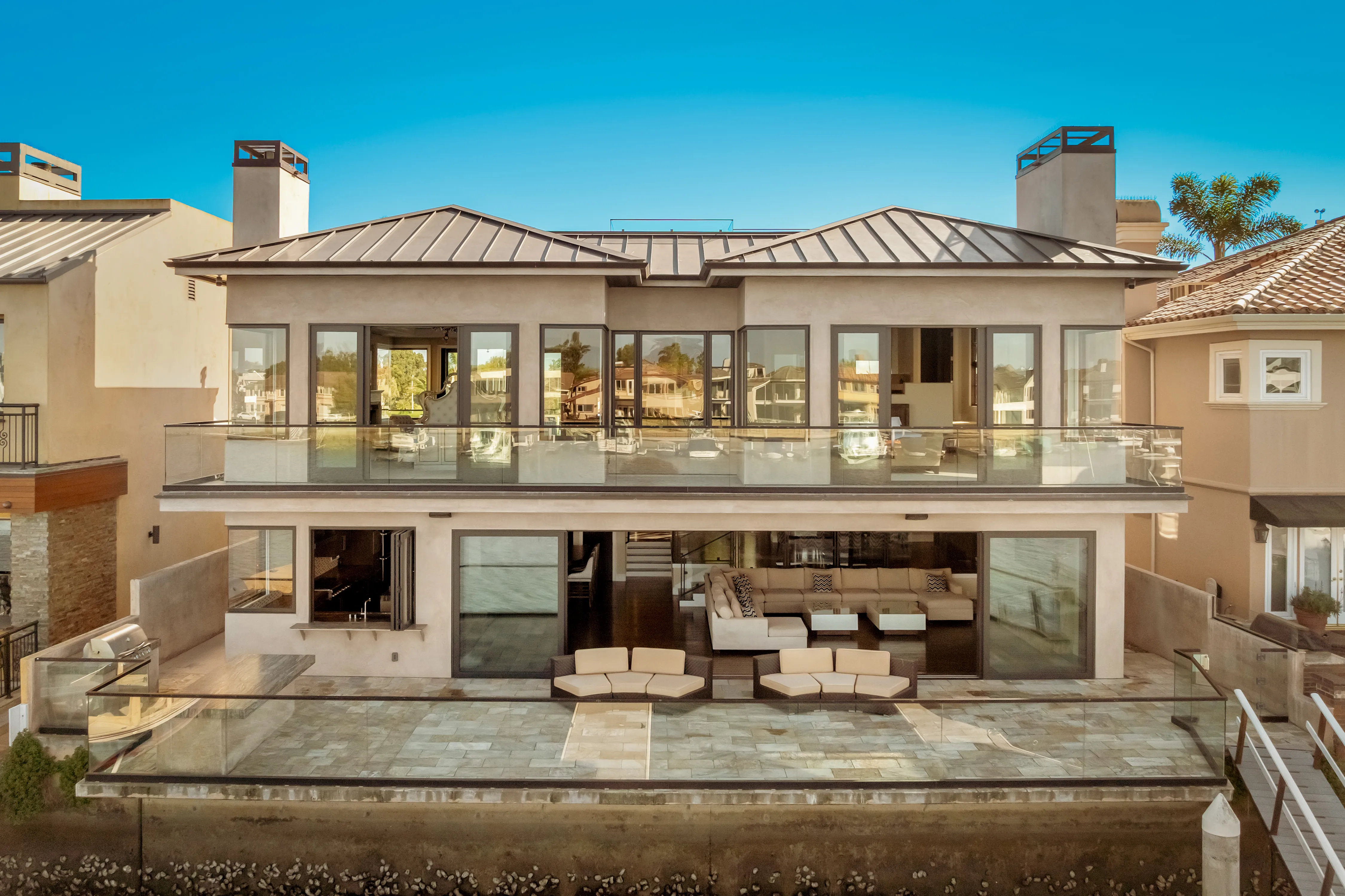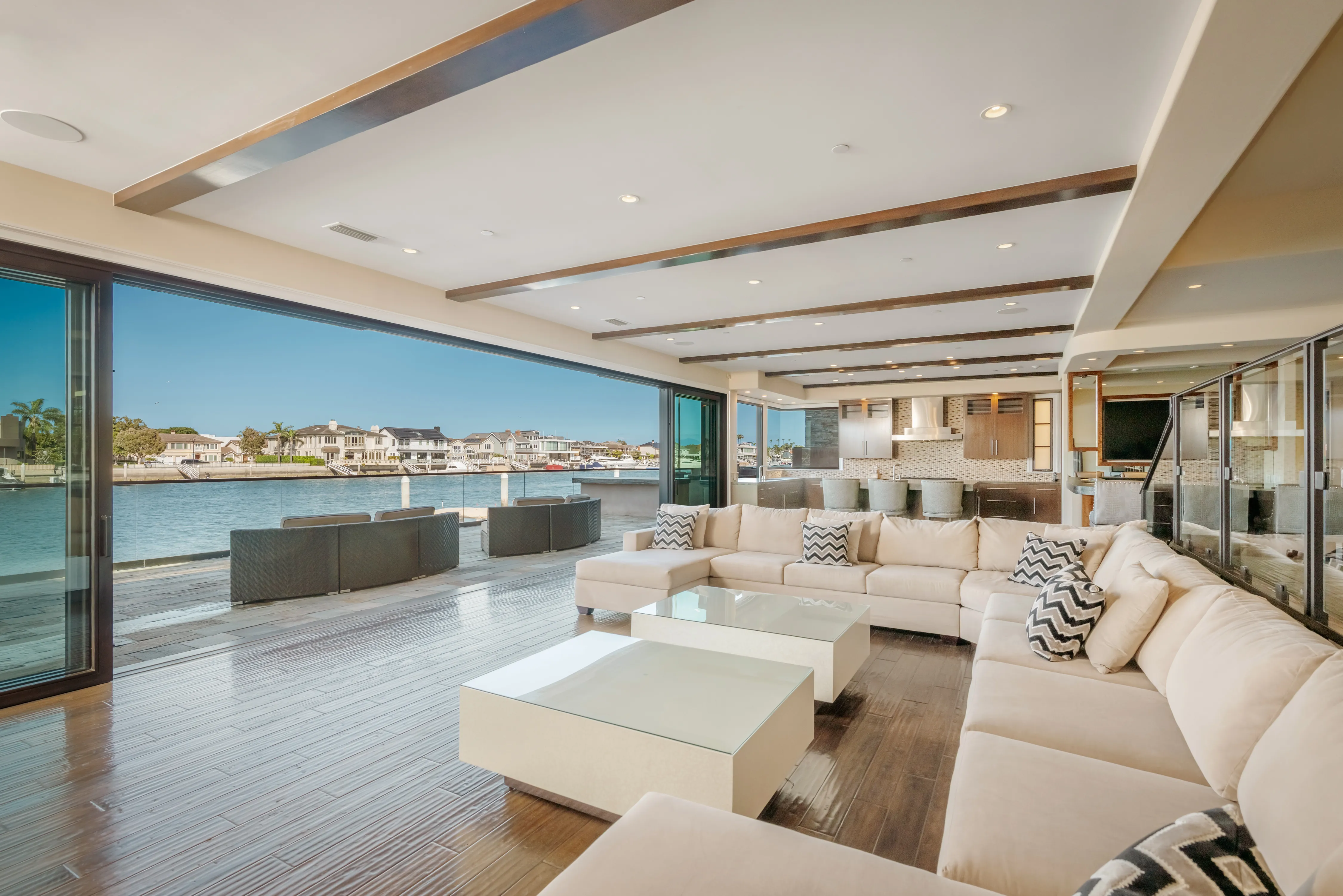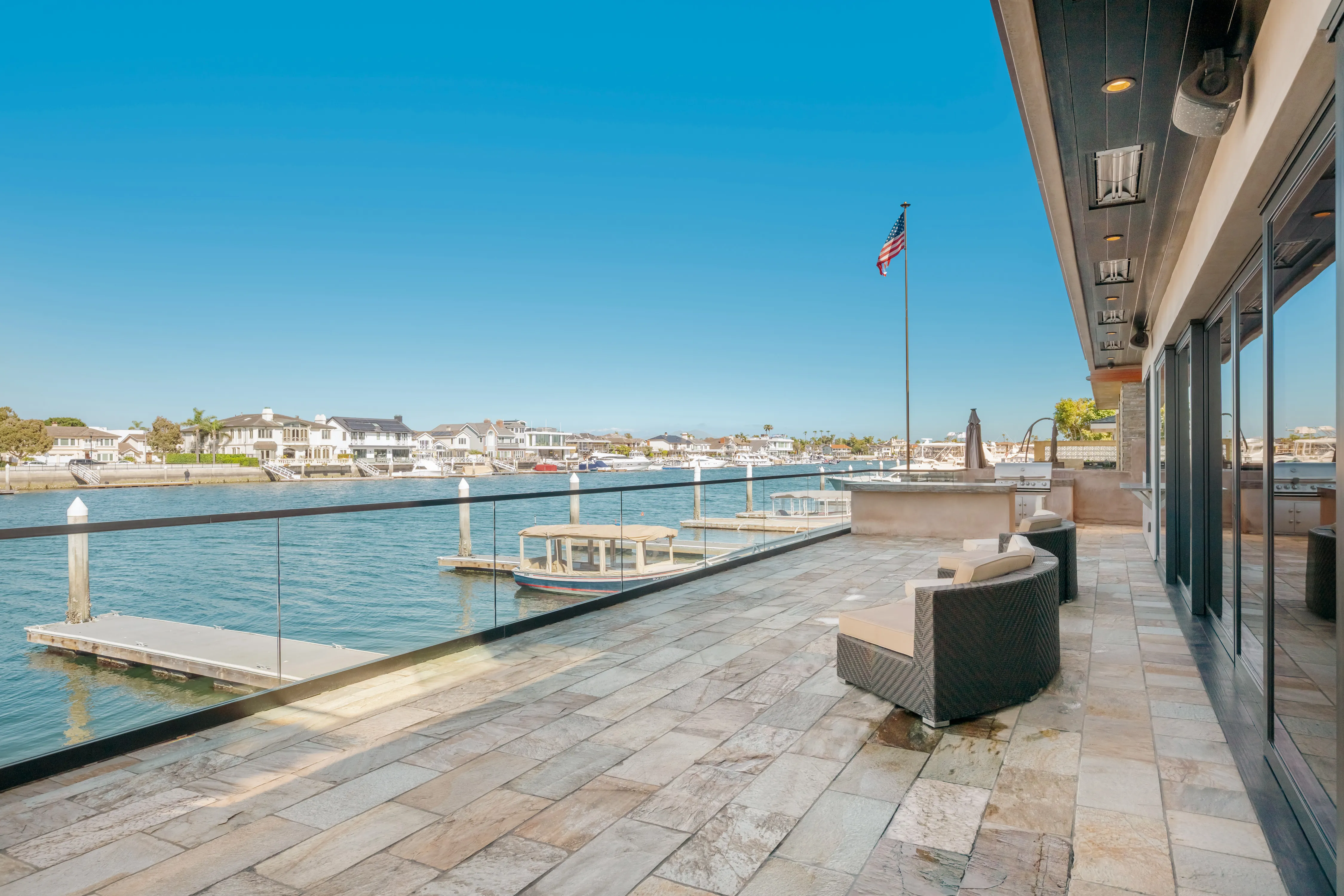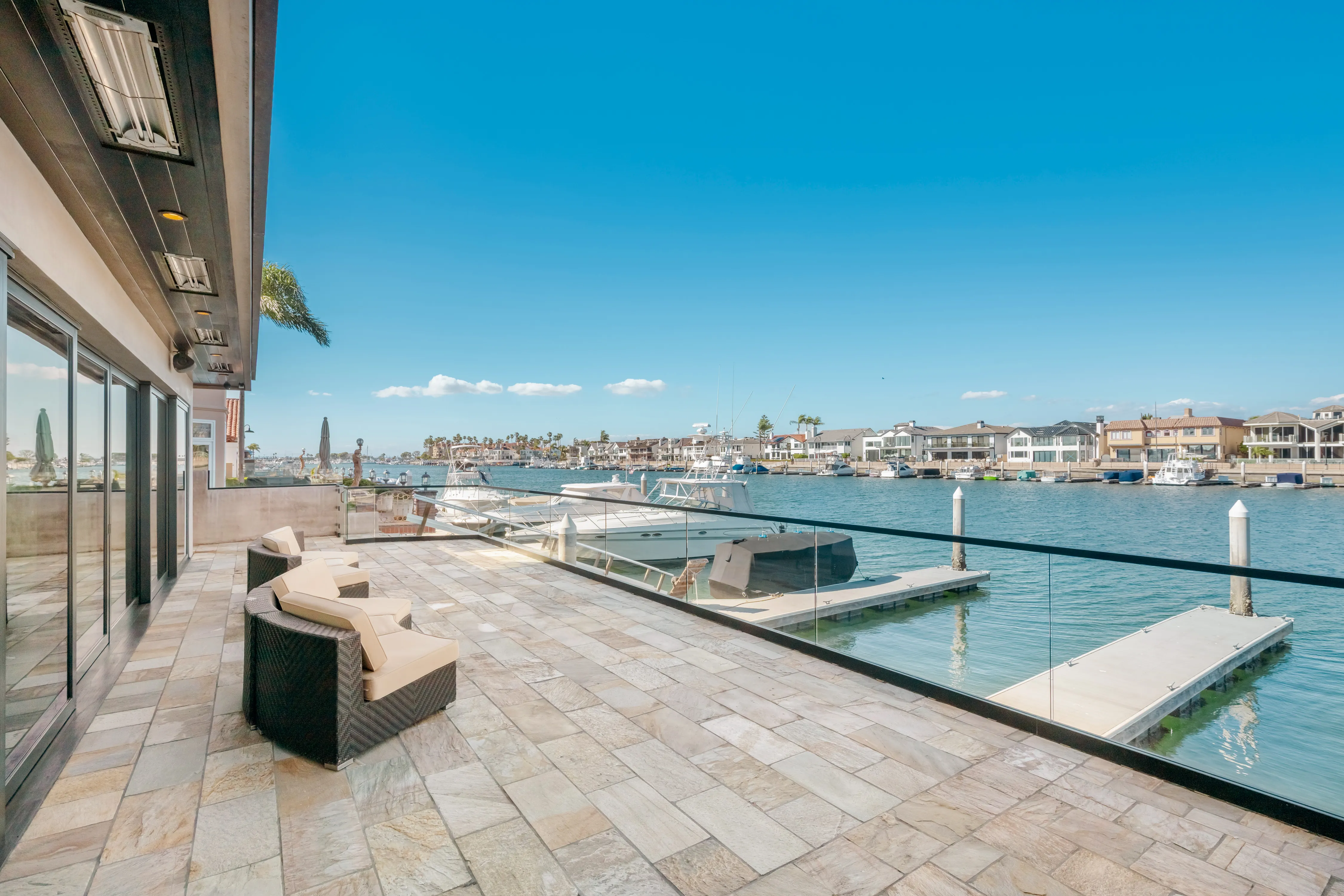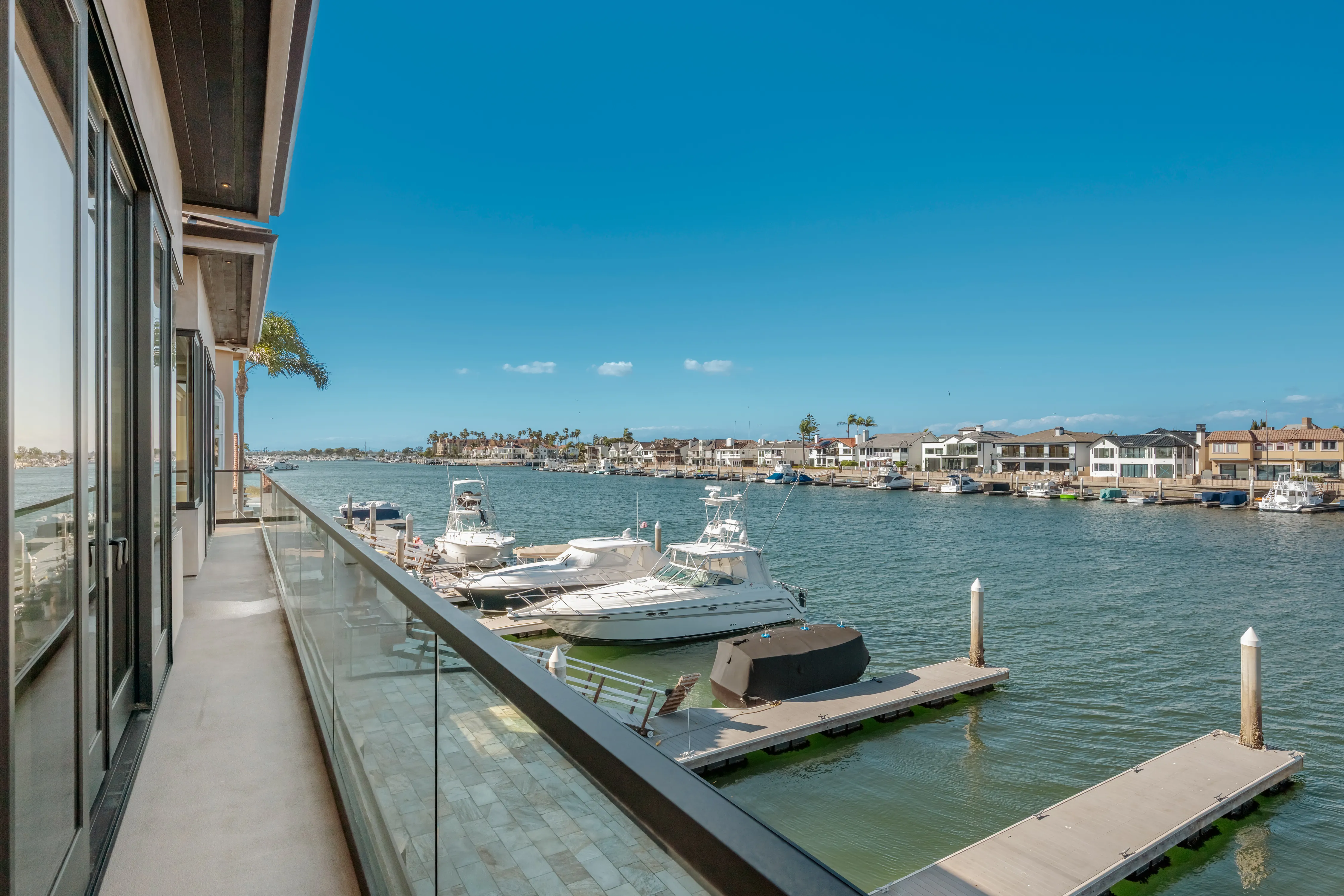 The rear terrace serves as a private vantage point for the vibrant maritime theatre of Huntington Harbour, offering sweeping views of passing yachts and local voyagers.