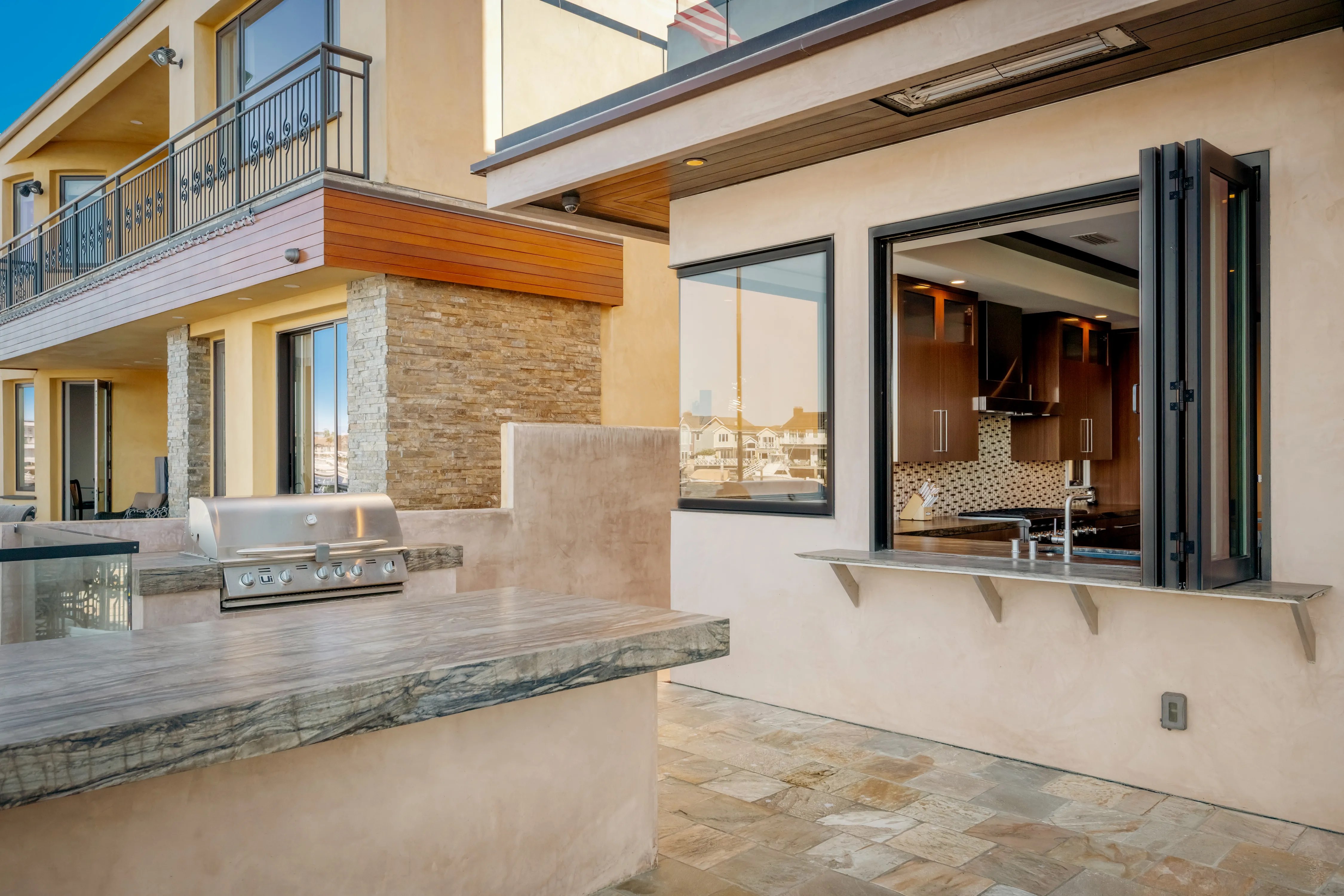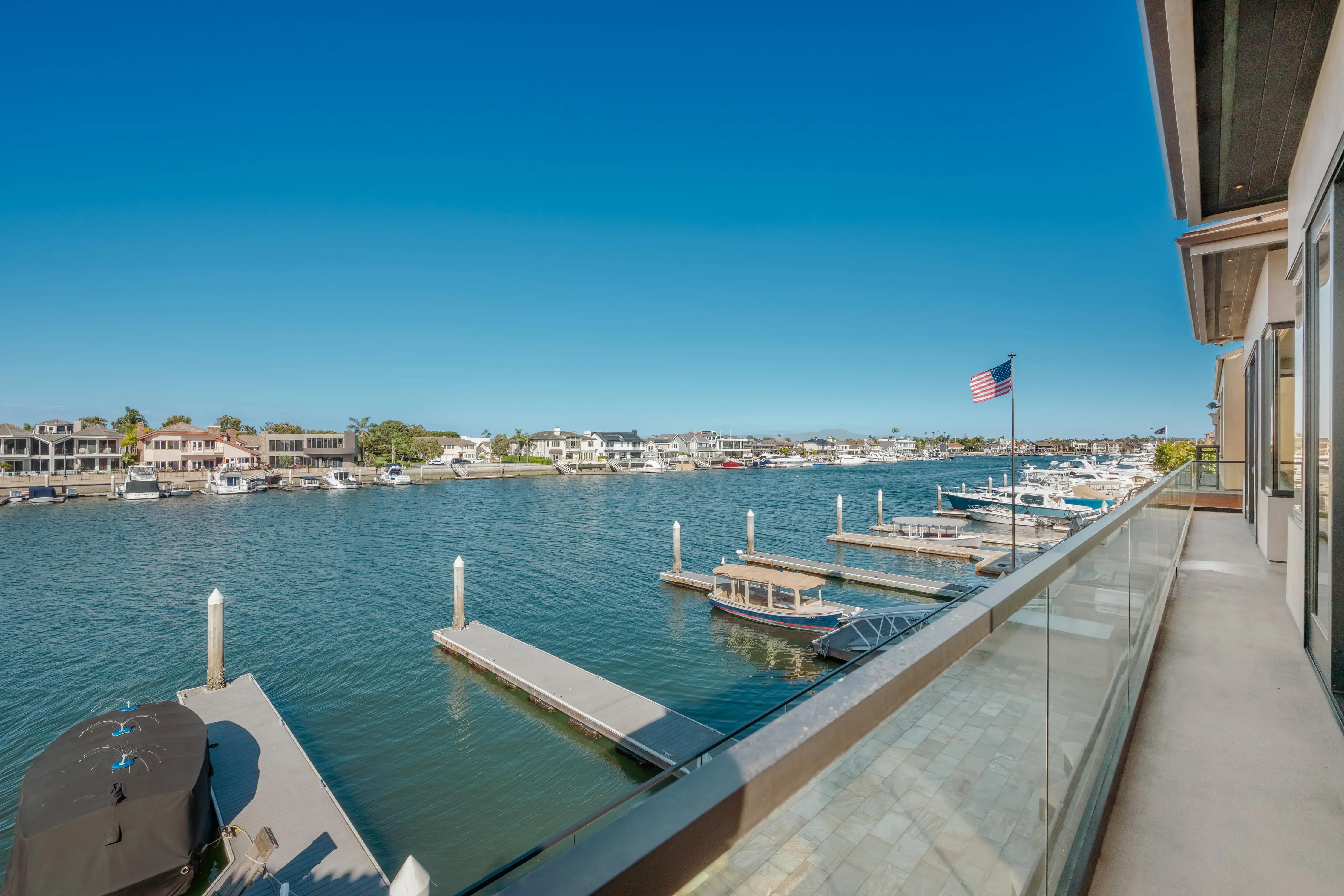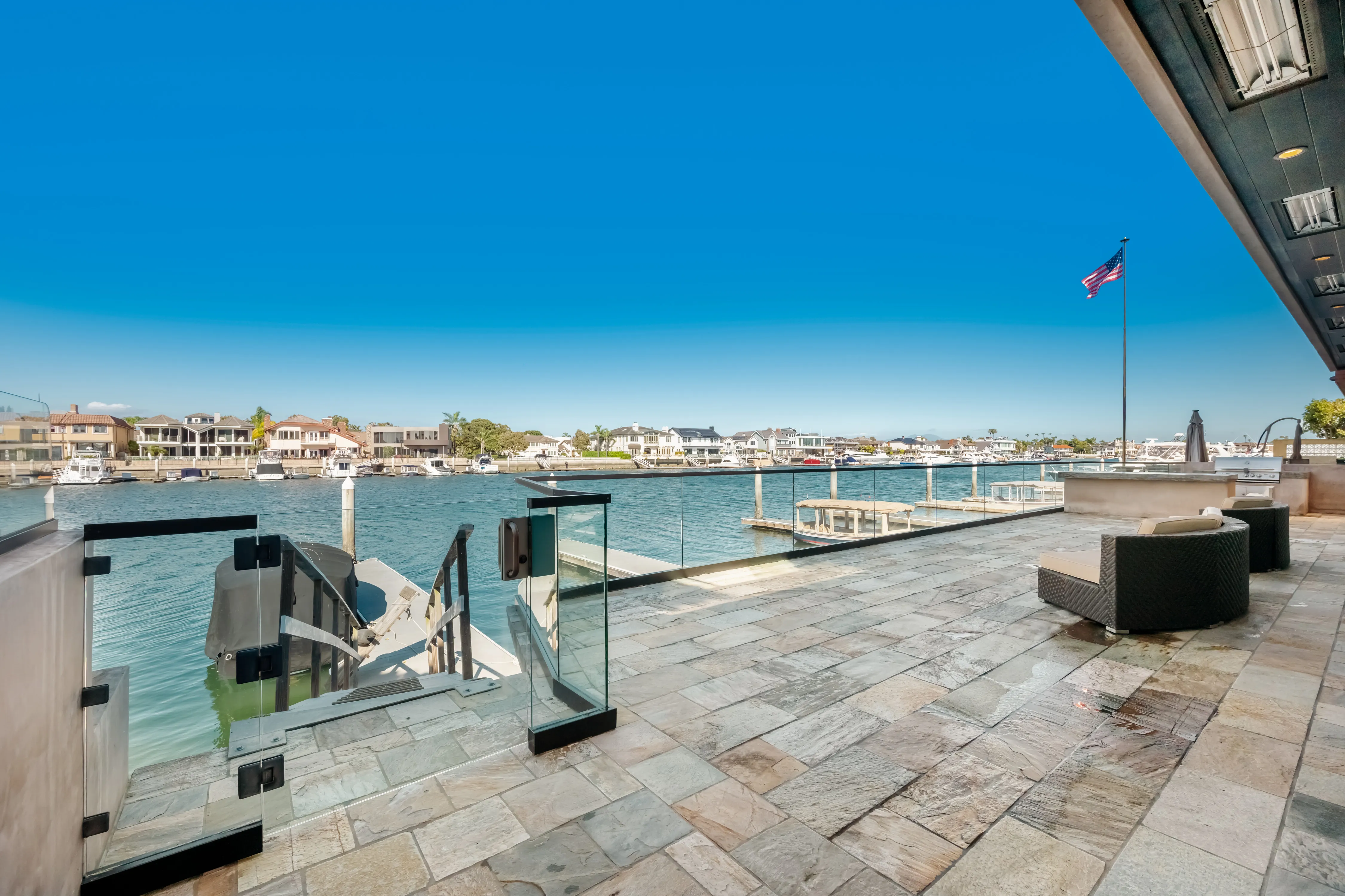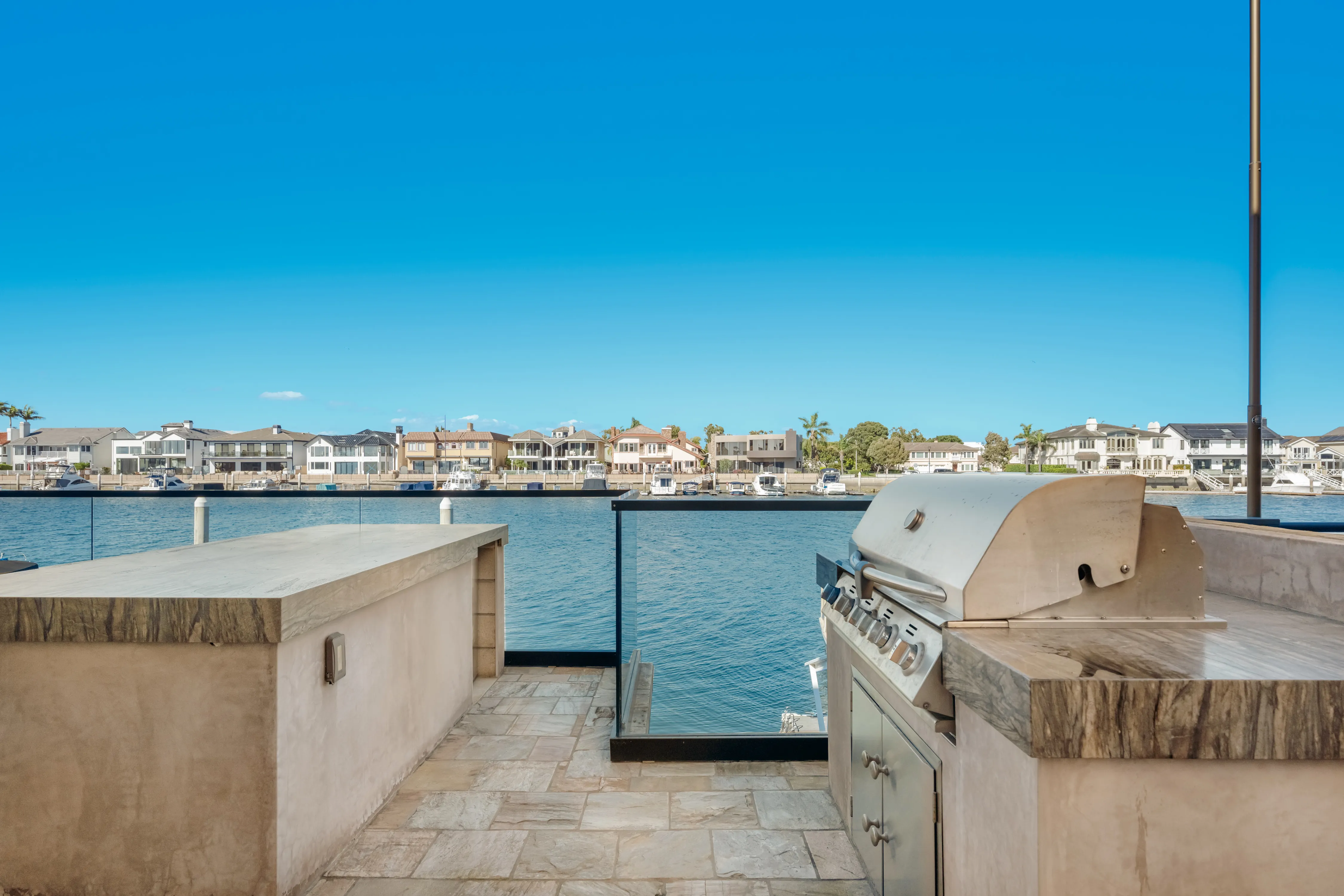The rear terrace serves as a private vantage point for the vibrant maritime theatre of Huntington Harbour, offering sweeping views of passing yachts and local voyagers.